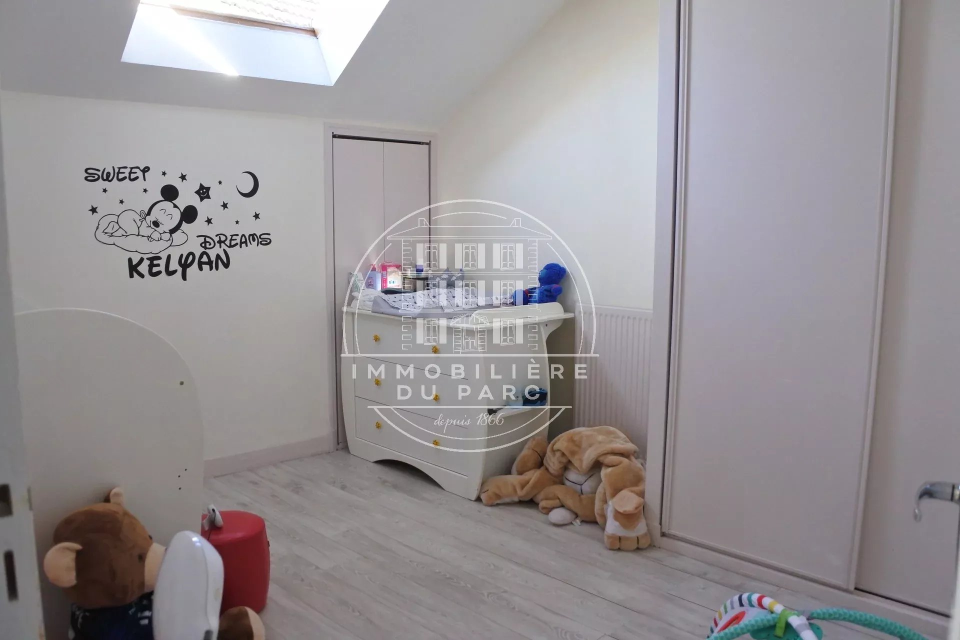 A l'étage : deux grandes chambres mansardées avec placards, salle de bains et wc indépendant.