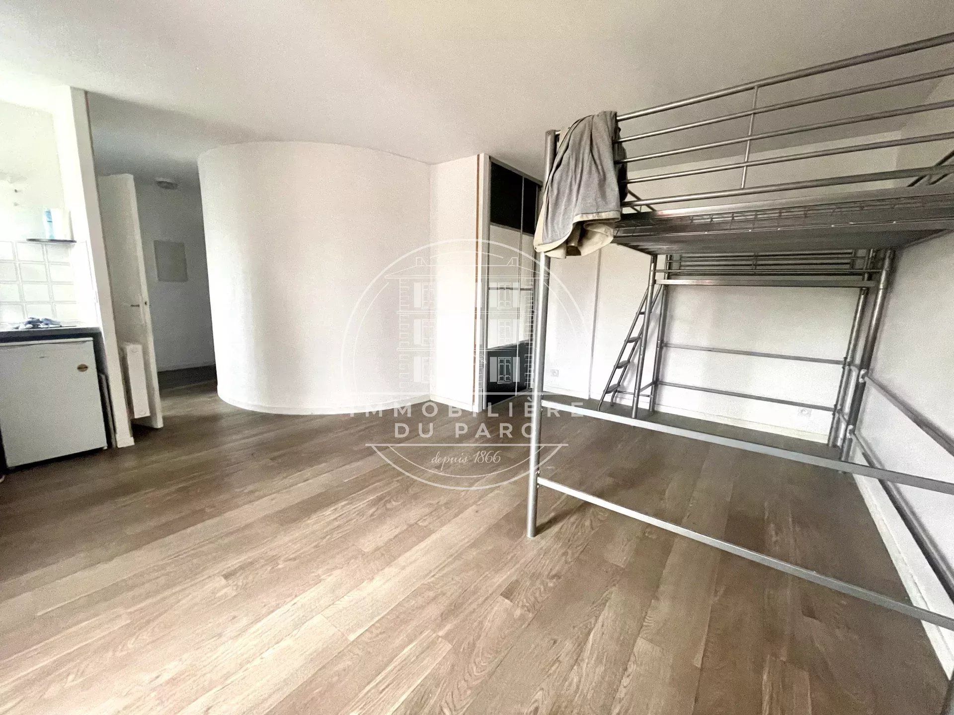 Appartement studio comprenant : une pièce principale, une cuisine et une salle de bains avec WC.